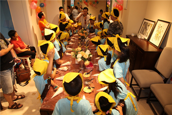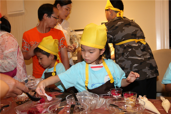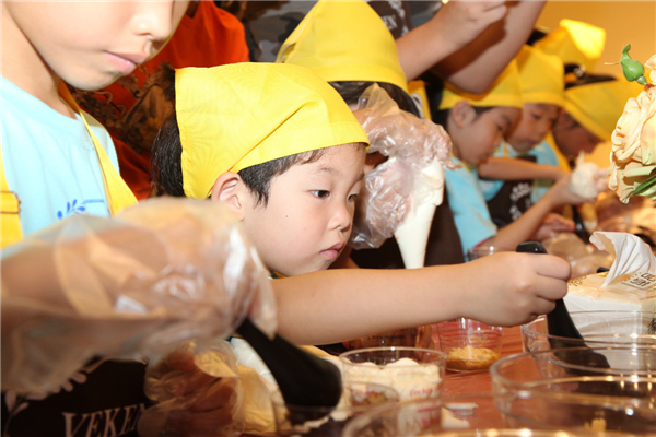 鋪上薄薄的一層餅干碎,擠上一層厚厚的奶油,再鋪上一層餅干碎,再擠上一層奶油……看似簡單的操作,著實(shí)讓小朋友們手忙腳亂了一番,這倒是樂壞了旁邊本就蠢蠢欲動的家長們,紛紛上手親自操刀原本就不大的場地顯得更加熱鬧擁擠。